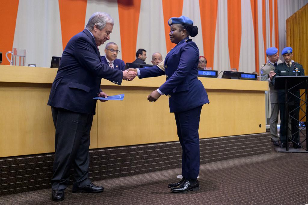 The Secretary-General commended Sergeant Sharon Sim for her role in helping to better understand the concerns of women and girls and formulate possible solutions, which played a vital role in enabling the peacekeeping force to respond to the needs of the local community, as well as for her extensive community outreach on gender-based violence and ending child marriage.