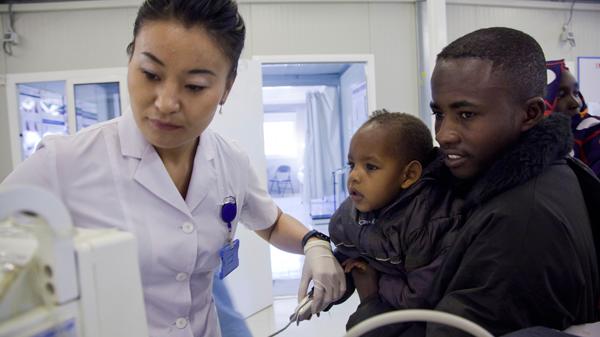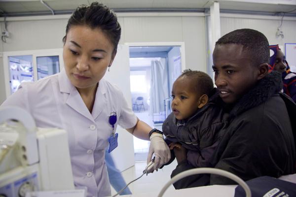 في 10 ديسمبر2012، كبكابية، شمال دارفور، طبيبة أطفال تعمل في مستشفى اليوناميد تجري فحصاً طبياً لأحد الأطفال. تصوير آلبرت غونزاليس فران، اليوناميد.