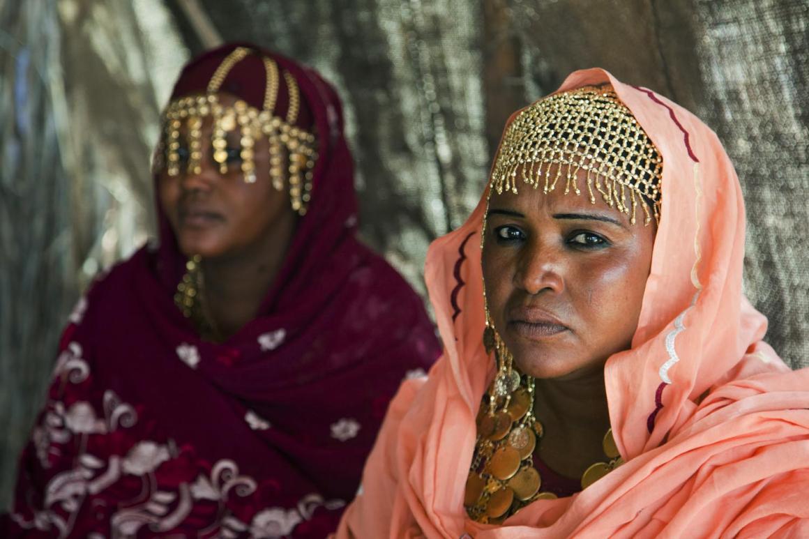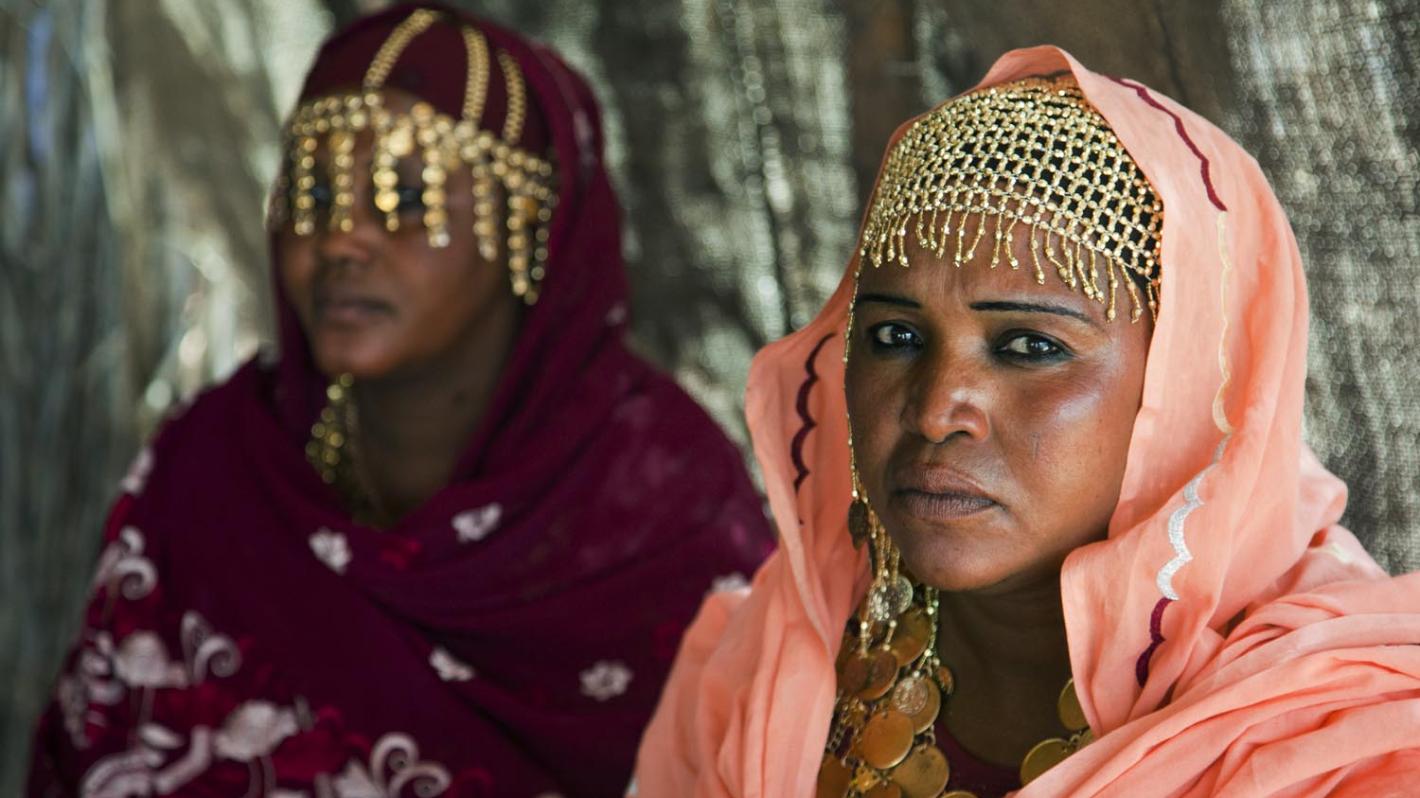 في 4 فبراير 2013 في الفاشر، شمال دارفور، فاطمة عبدو خليل في اليسار ومحاسن عثمان الطاهر في اليمين، وهما يظهران أمام الكاميرا. إنهما حكامتان، النساء اللاتي يمارسن تأثيرا ً إجتماعياً مهماً من خلال إلقاء الشعر والغناء. تصوير سجود القرّاي.