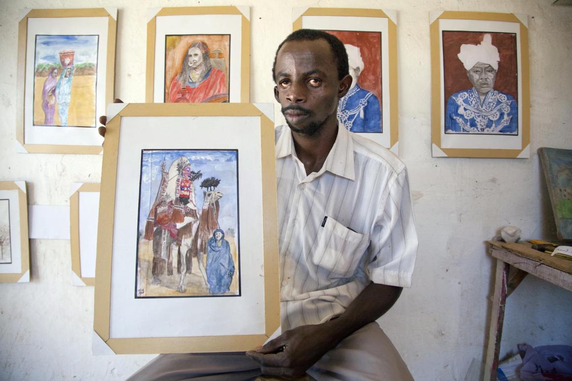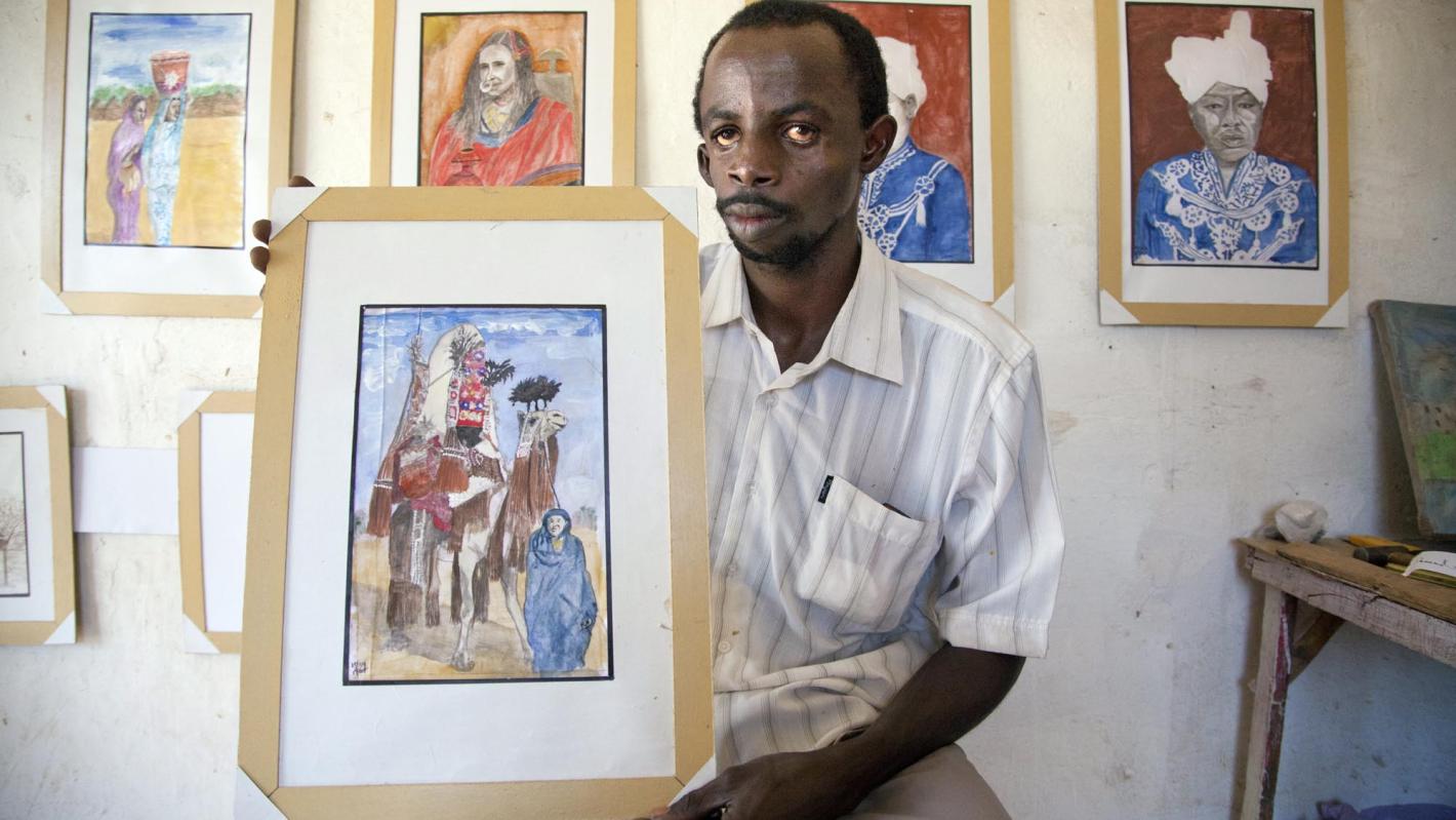 الفنان محمد يوسف بحيري يعرض لوحاته المعلقة في الاستوديو الخاص به في الجنينة، غرب دارفور. تصوير: ألبرت غونزاليس فران، اليوناميد.