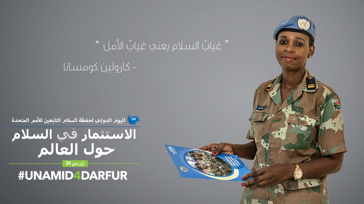 عملت الرائد كارولين كومسانا مع قوة دفاع جنوب إفريقيا الوطنية (سلاح الجو) لمدة 20 سنة. هذا هو عملها الرابع مع بعثات حفظ السلام الأممية. تحدثت الرائد كومسانا في هذه المقابلة القصيرة عن دورها المزدوج ككبير ضباط التعاون المدني العسكري ومنسق الجندر بقطاع الشمال بجانب التزامها بمسألة السلام.