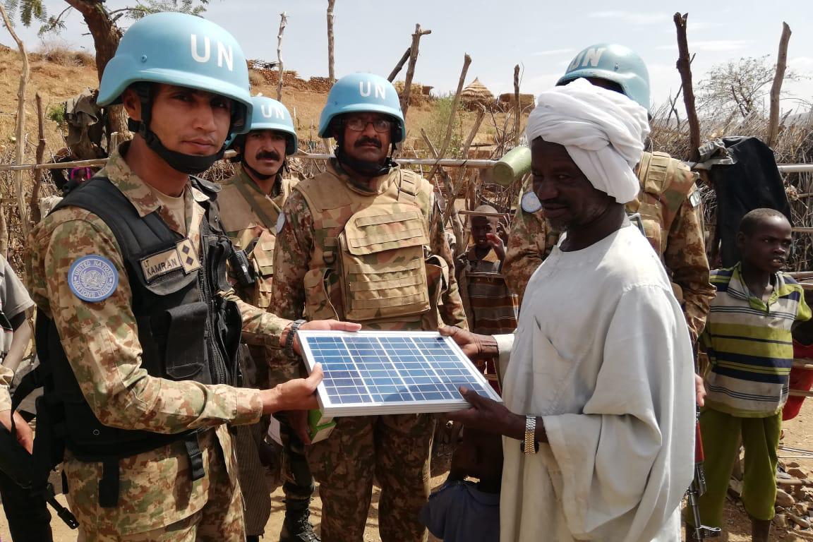 في 28 فبراير 2019، سلَّمت قوات حفظ السلام الباكستانية باليوناميد عدد 4 أنظمة لألواح الطاقة الشمسية وملحقات كهربائية (بطاريات وأسلاك ومصابيح وحوامل وموصلات بالإضافة الى مفاتيح الكهربائية) إلى 3 مدارس قرآنية (محمد آدم عبد الله…