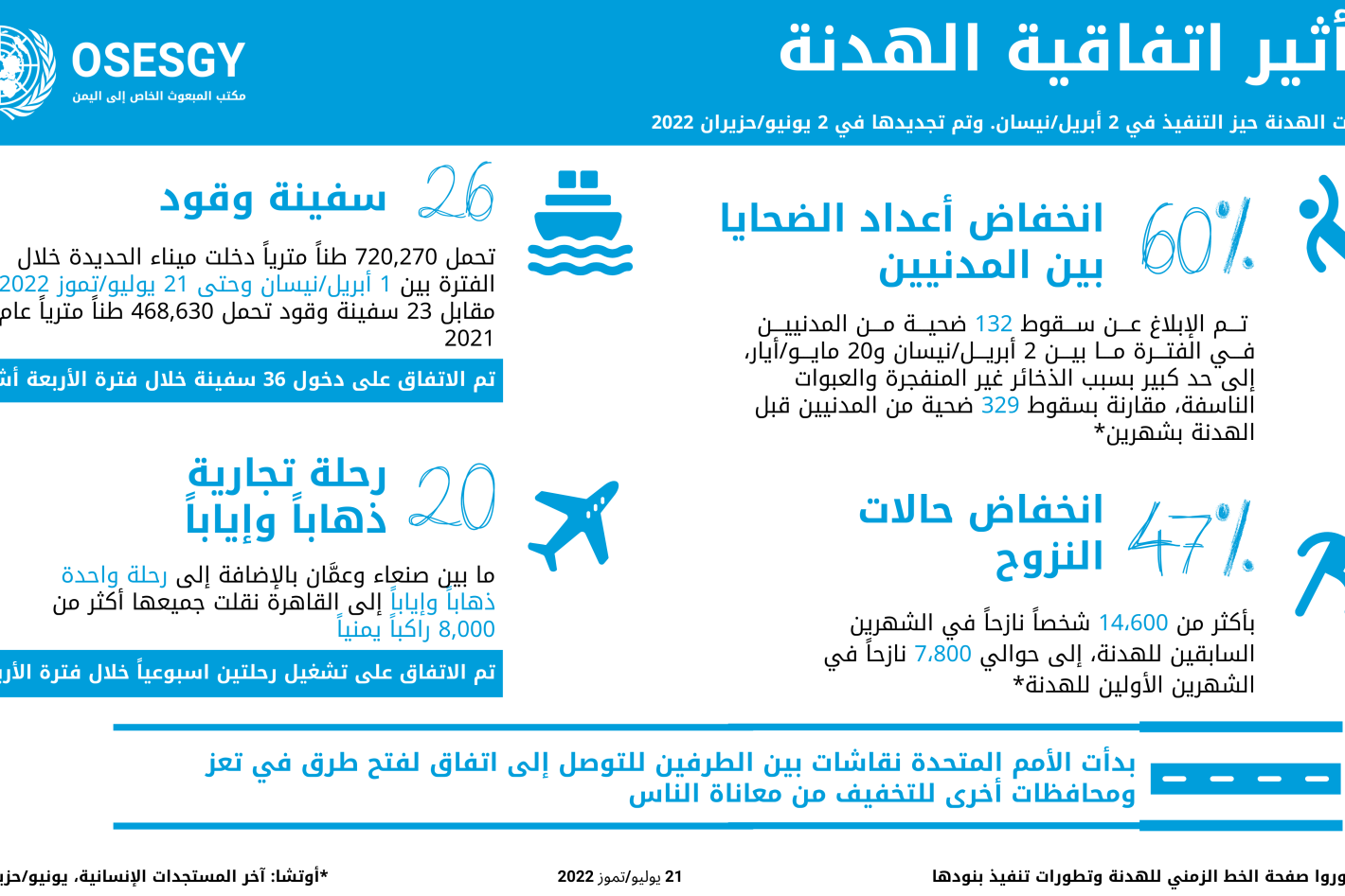 عمان ، 5 يوليو 2022 - عقدت لجنة التنسيق العسكرية اجتماعها الثالث اليوم في عمّان، الأردن، بتيسير المستشار العسكري للمبعوث الخاص للأمم المتحدة العميد أنطوني هايوارد. اتفق الممثلون العسكريون للحكومة اليمنية وأنصار الله وقيادة…