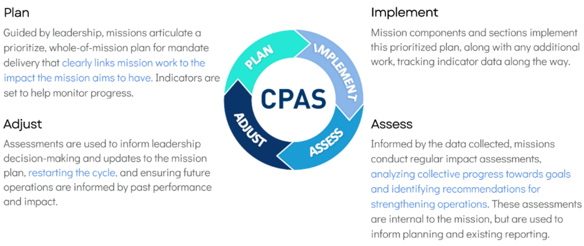 - Strengthen operations: CPAS assessments let mission staff work together to develop recommendations for strengthening operations, informed by data and analysis. As a result, missions are also continually capturing lessons learned and adapting activities based on what has the most impact