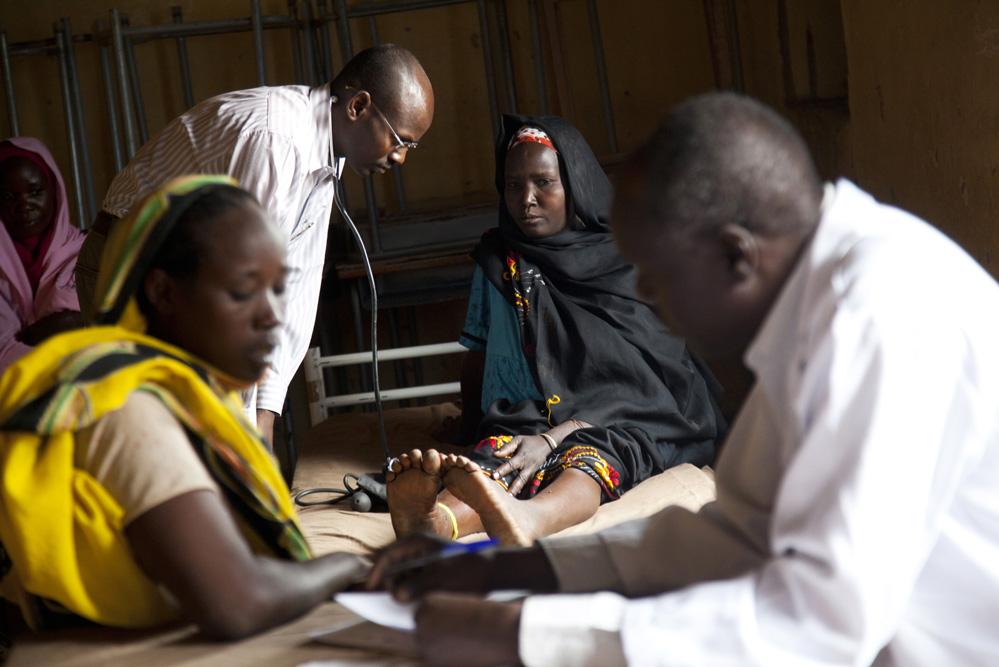 Fatma Abdarraman, a woman from the Kassab camp for internally displaced persons (IDPs) in Kutum, North Darfur, is assisted by doctors, who attend to several leg injuries. Photo by Albert González Farran