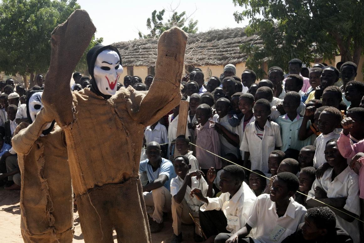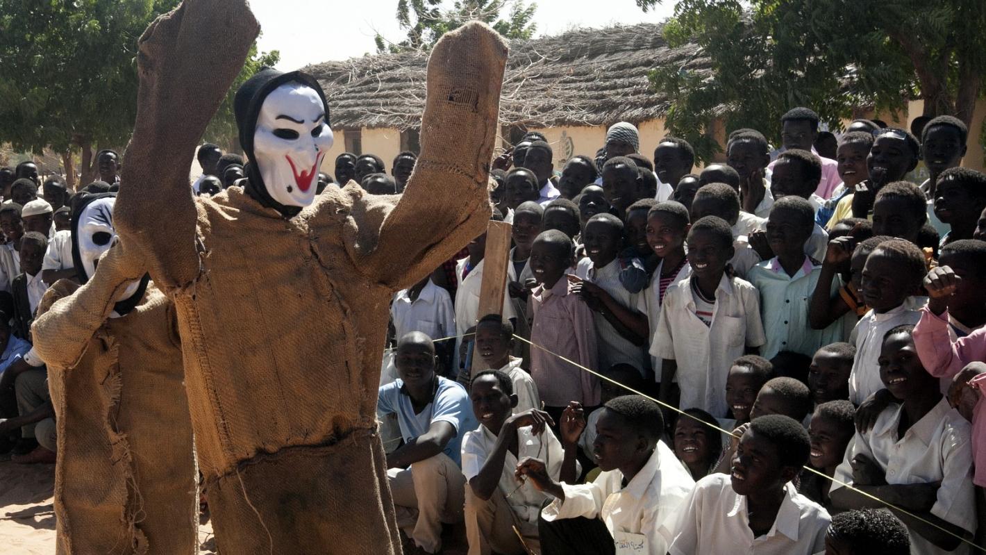 On 10 December, an actor performs a drama presentation in Al Salam IDP camp, North Darfur, during Human Rights Day celebration. Photo by Hamid Abdulsalam.
