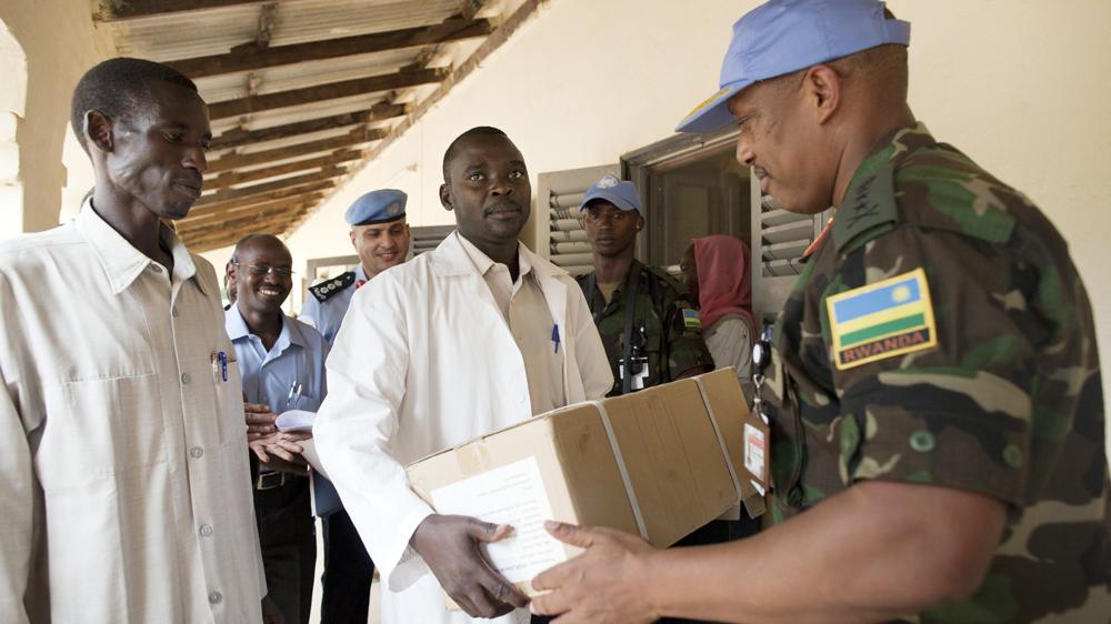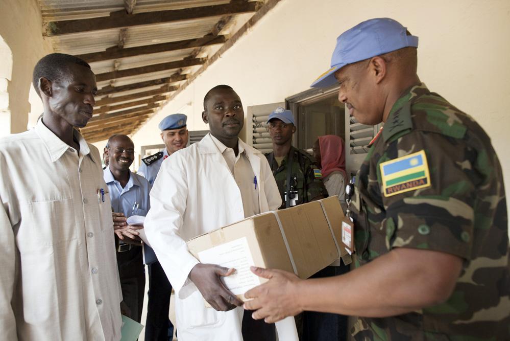 (Right to left) UNAMID Force Commander Patrick Nyamvumba hands out medical supplies to doctor Noureldeen Adam, director of the Rural Hospital in Kutum, and Mustafa Bakhit, the Deputy Commissioner of Kutum. Photo by Sojoud Elgarrai.
