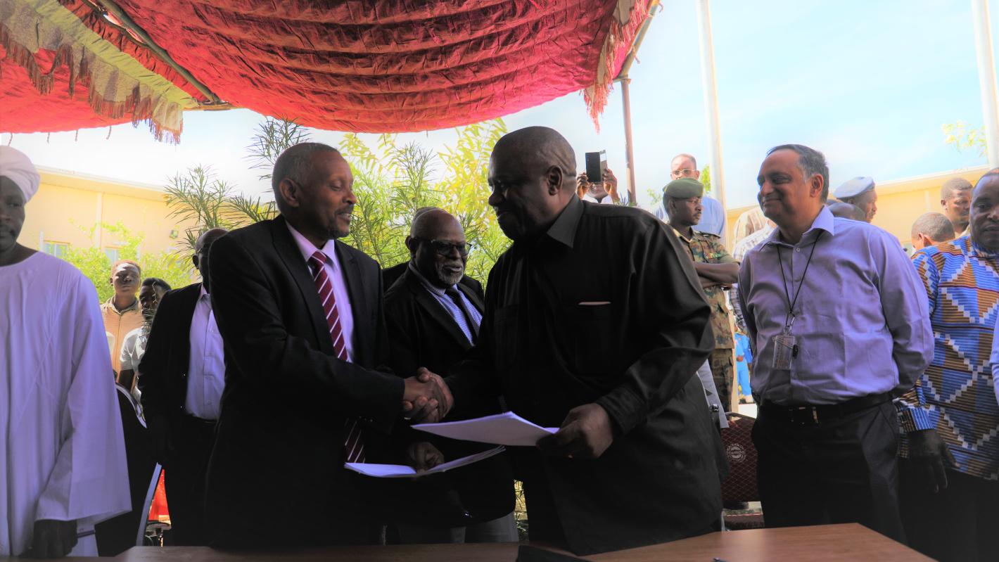 Nyala, 19 November 2019; the African Union – United Nations Hybrid Operation in Darfur (UNAMID) handed over its Sector Headquarters in Nyala, South Darfur, to the Government of Sudan. The handover documents were signed by UNAMID Joint Special Representative (JSR), Jeremiah Mamabolo and Ambassador Omer Al Farouq Al Sanosi, Representative of Sudan Ministry of Foreign Affairs.