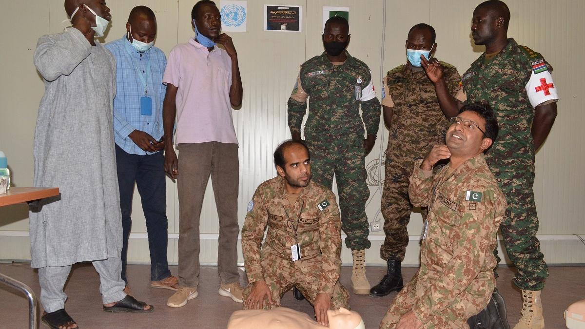 Zalingei- 26 November; UNAMID Forward Surgical Team from Pakistan organized a “Basic Life Support (BLS)’’ training session for 18 volunteers from the local community and members of the Military contingents. The training, held at the Mission’s Headquarters in Zalingei, Central Darfur, involved practical demonstrations on prompt recognition of life-threatening emergencies to help the victims with life-threatening illnesses or injuries before they are given full medical care at the hospital or clinic.