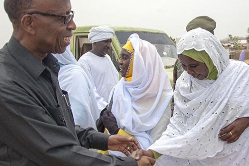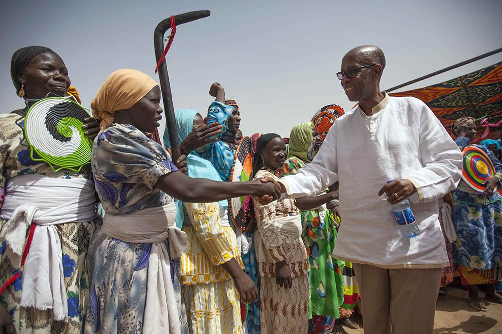 On 19 May 2014, UNAMID Deputy Joint Special Representative Joseph Mutaboba greets women during the inauguration ceremony for a new women's centre in the locality of Masteri, West Darfur. The inauguration event drew several…