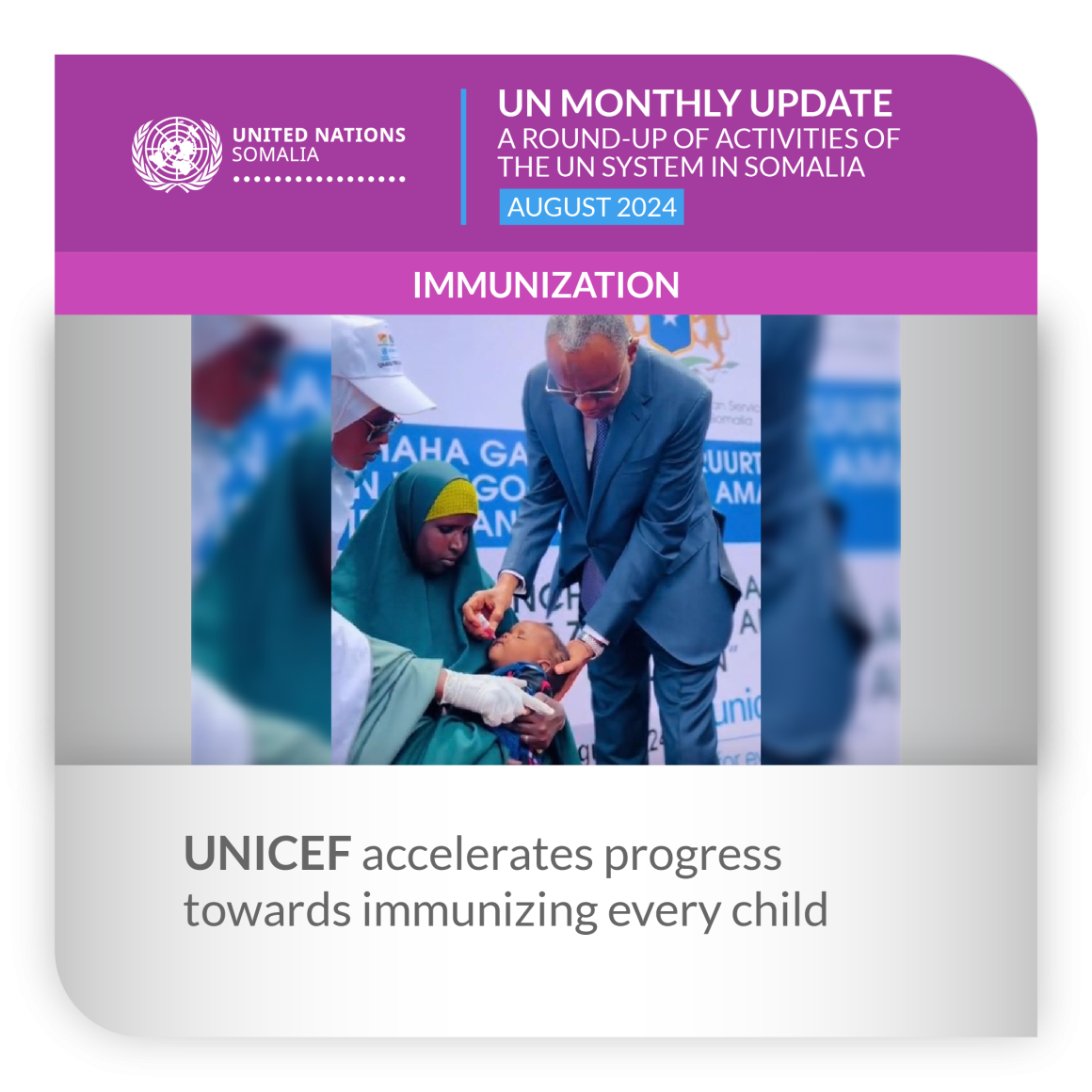 ![]() | Immunization | UNICEF accelerates progress towards immunizing every child The Government of Somalia, WHO and UNICEF combined efforts to accelerate progress towards immunizing every child. Firstly, Somalia’s Prime Minister Hamza Abdi Barre launched the Somalia Immunization and Polio Eradication (SIPE) Task Force, which will oversee and coordinate polio eradication and immunization efforts across the country using lifesaving vaccines. Secondly, the ‘Big Catch-up’ initiative was launched simultaneously in the country’s Federal Member States (FMSs). The initiative is ongoing nationwide and aims to reach 1.5 million under-five children who have never received a vaccine, and under-immunized children. According to UNICEF, getting children vaccinated is safe and life-saving, and prevention is better than seeking a cure. | |