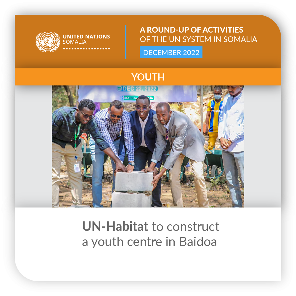![]() | Youth | UN-Habitat to construct a youth centre in Baidoa UN-Habitat held a groundbreaking ceremony for the construction of a youth centre in Baidoa, South West State of Somalia. One-stop youth centres are the result of a partnership between UN-Habitat and local governments. They operate on a principle of an integrated approach to youth development, providing youth with safe spaces in urban settings where they can meet and access information and resources critical to youth-led development, including peacebuilding, research, and policy development. The government of Sweden funds this initiative. | |