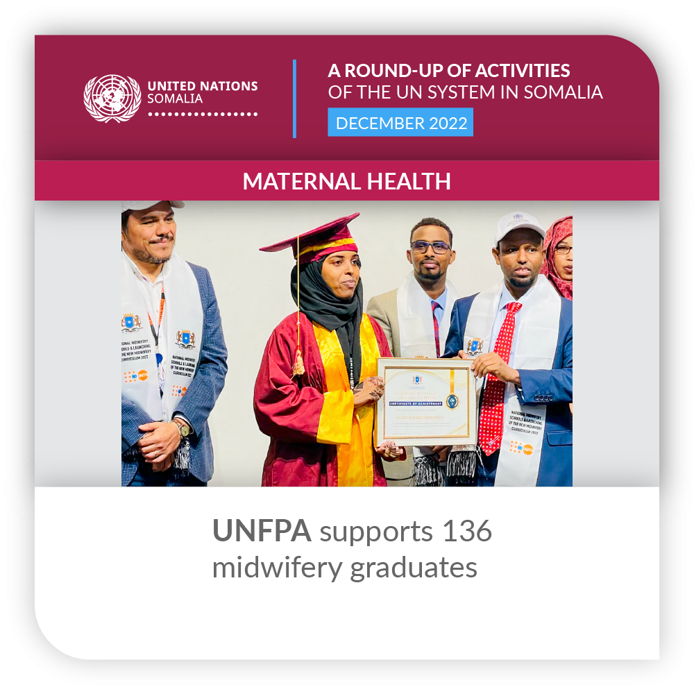 ![]() | Maternal health | UNFPA supports 136 midwifery graduates On 11 December, 136 midwives from schools supported by the United Nations Population Fund (UNFPA) and Global Canada Affairs graduated in Mogadishu. On this day, a new midwifery curriculum for Somalia was also launched. During this time of drought in Somalia, there is an increasing need for life-saving healthcare services, especially for pregnant women and mothers. Qualified midwives provide critical quality maternal healthcare before, after, and during pregnancy and save the lives of women and children. UNFPA continues supporting midwives and the midwifery profession in Somalia to ensure better health for all. | |