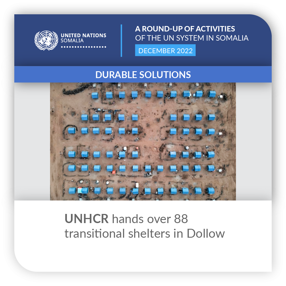 ![]() | Durable solutions | UNHCR hands over 88 transitional shelters in Dollow In Dollow, Ladaan, internally displaced persons (IDP) camp, southern Somalia, the Office of the United Nations High Commissioner for Refugees (UNHCR) handed over 88 emergency transitional shelters to vulnerable displaced families. The project is implemented by UNHCR partner African Volunteers for Relief and Development (AVORD). As the effects of climate change, persistent insecurity, armed conflict, extreme poverty, and soaring food prices intensify, the resilience of the displaced families erodes, increasing their vulnerability to shocks. UNHCR will continue providing life-saving assistance and durable solutions such as transitional shelters to those in most need across Somalia. | |