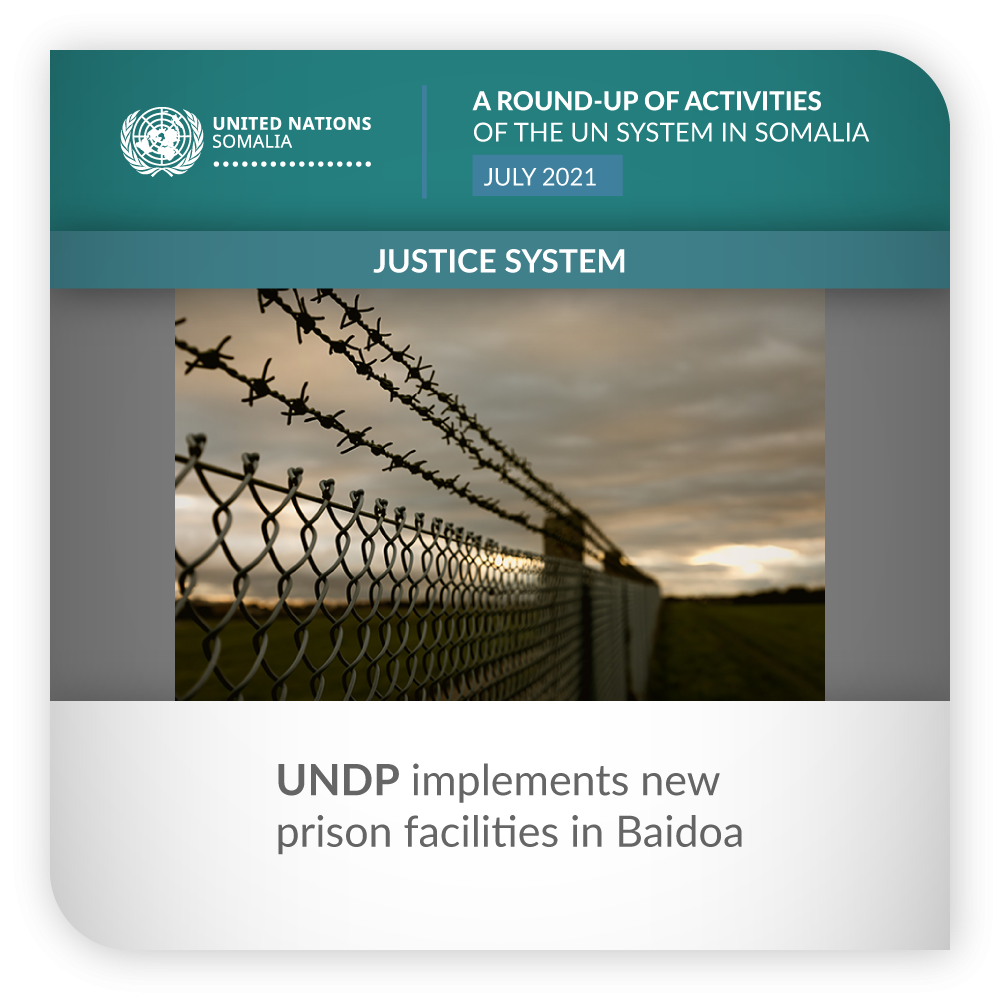 UNDP and UNSOM are supporting the Federal Government to build new prison facilities in Baidoa using nationally owned procurement systems, funded by the Government of Sweden. At the project’s completion, it will both replace the old prison and provide facilities for rehabilitation, education and rule of law-related training activities.