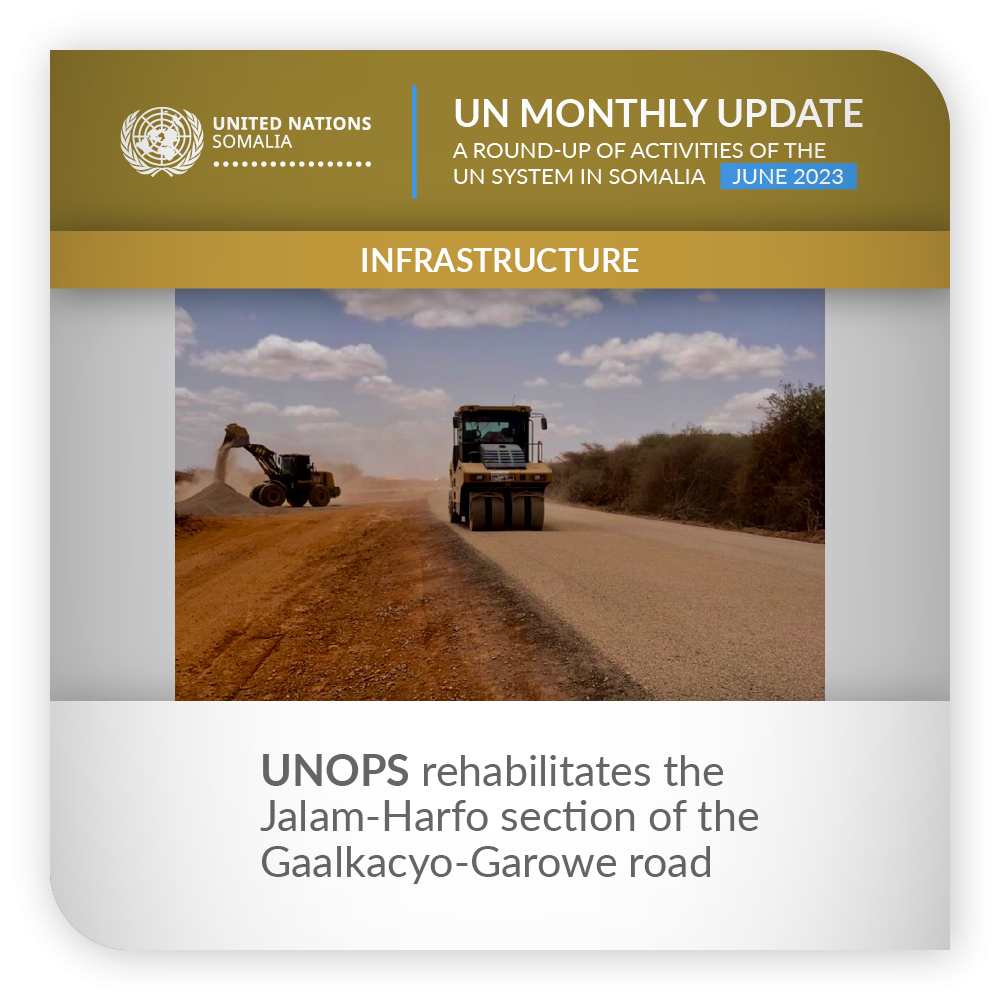 ![]() | Infrastructure | UNOPS rehabilitates of the Jalam-Harfo section of the Gaalkacyo-Garowe Road UNOPS is rehabilitating a 54 km section of the Gaalkacyo-Garowe road in Somalia, connecting two major towns in Puntland state. The project aims to improve economic activities, social interactions, and security by enhancing transportation between the cities. It will also provide better access to remote areas, promoting economic development and improving the quality of life for residents. Despite challenges posed by rugged terrain and a lack of infrastructure, UNOPS is committed to the successful completion of the project. Capacity building for the Puntland Highway Authority ensures long-term maintenance and management of the road. This rehabilitation effort plays a crucial role in enhancing regional infrastructure and economic prospects, benefiting the people of Somalia. | |
