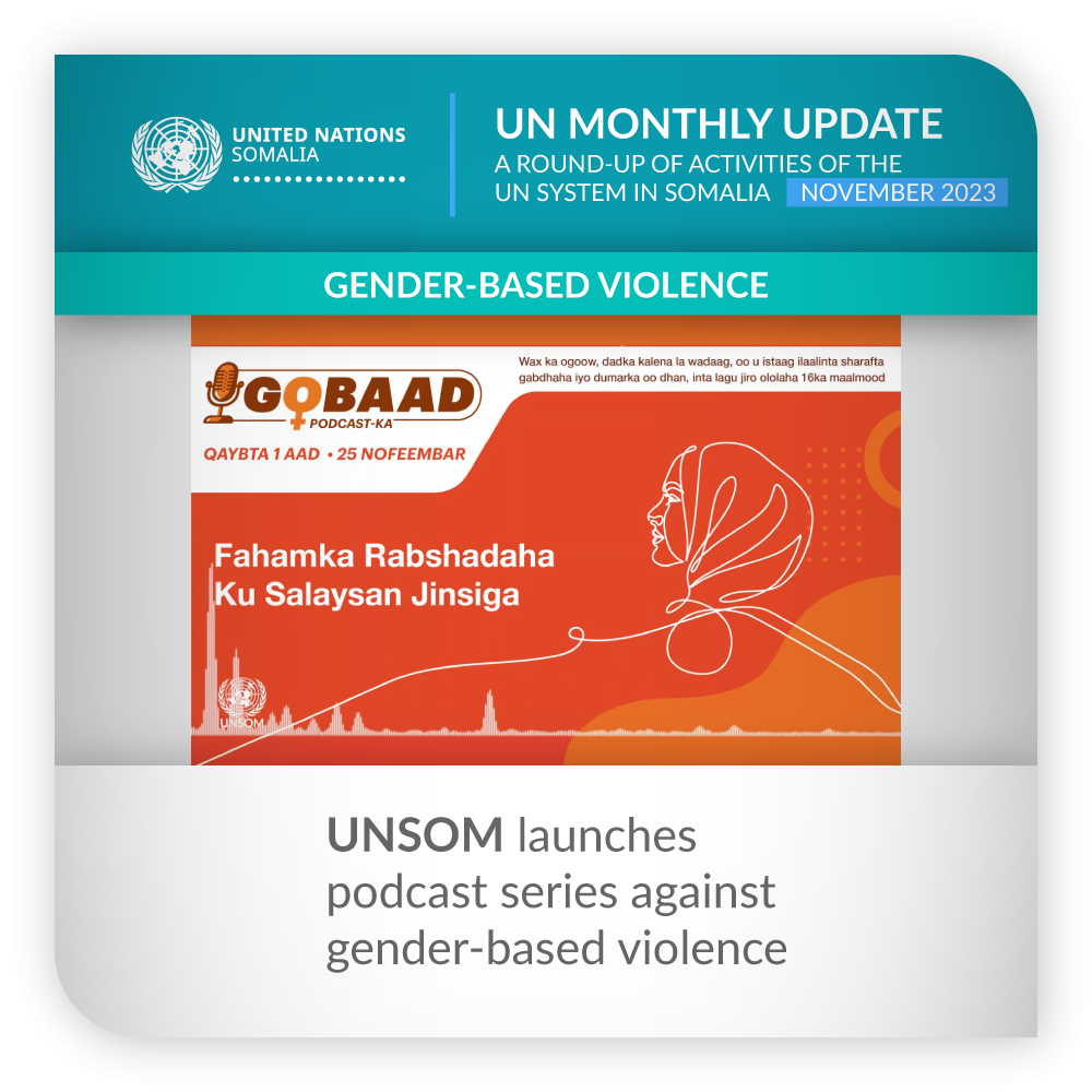 ![]() | Gender-based violence | UNSOM launches podcast series against gender-based violence To mark the 16 Days of Activism Against Gender-Based Violence, a global campaign that runs from 25 November to 10 December, UNSOM launched a new podcast series, ‘Gobaad: Dignity for All,’ to raise awareness and take action against gender-based violence (GBV) in Somalia. ‘Gobaad: Dignity for All’ is a series of eight episodes that will explore various aspects of GBV, such as online harassment, disability and gender inequality, rural women and GBV, and the role of the government and collective action of the international community in addressing this issue. Each episode will feature a guest speaker who is an expert or an activist in the field of GBV prevention and response. The first episode of ‘Gobaad: Dignity for All’ was released on Saturday, 25 November, and featured the UN Special Representative for Somalia, Catriona Laing, as she introduced the 16 Days of Activism and the different forms of GBV in Somalia. The podcast is available on Youtube, Facebook and X and was also broadcast on regional radio stations Waamo Radio, Isnaay Radio, Sanguuni Radio, Beerlula Radio, Arlaadi Radio and Radio Daar-Dheer. | |