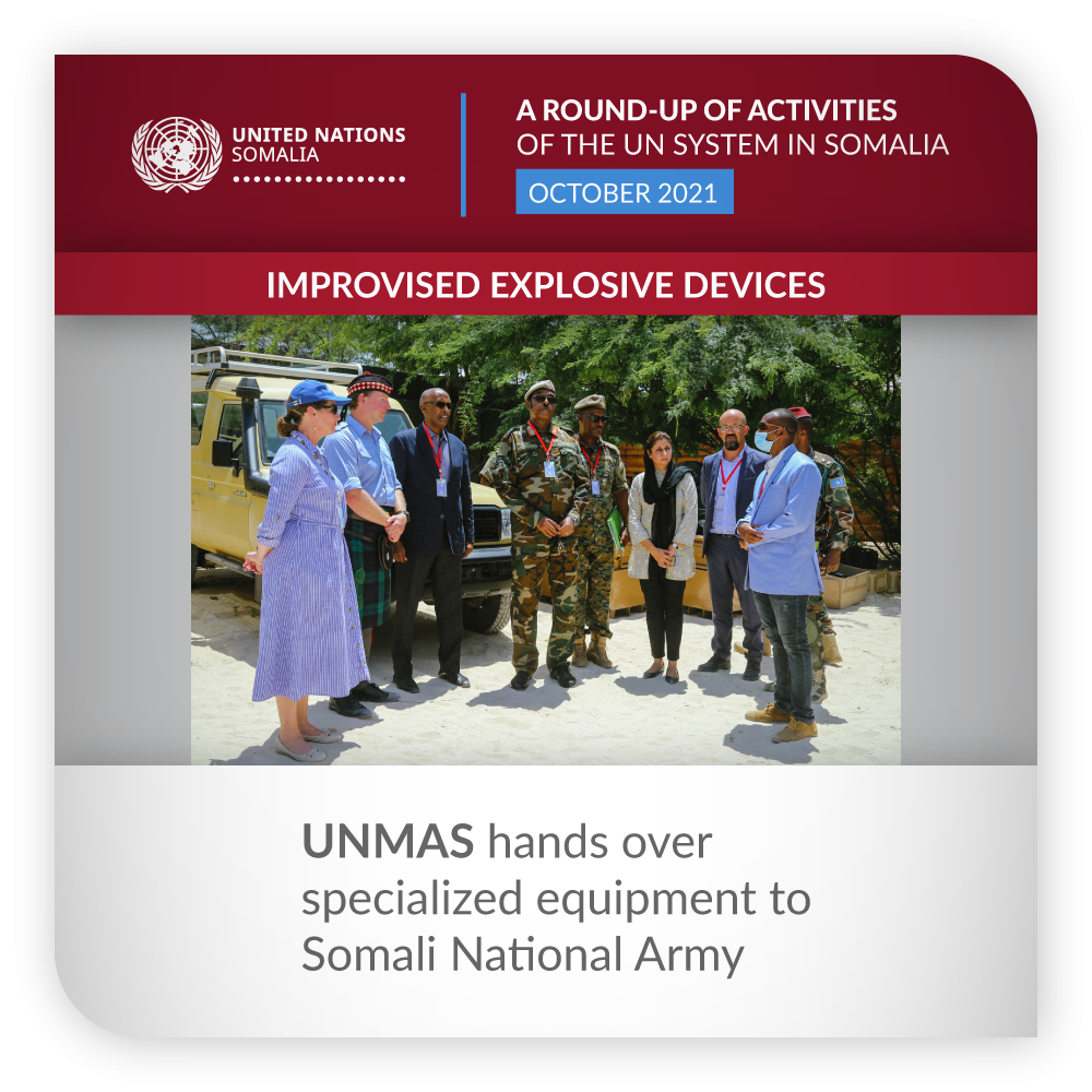 ![]() | Improvised Explosive Devices | UNMAS hands over specialized equipment to Somali National Army In the presence of senior UN and UK officials, UNMAS handed over specialized equipment to the Somali National Army as part of the latter’s counter-improvised-explosive-device (IED) capacity development process, in line with the Somalia Transition Plan, which is a comprehensive guide developed by the Federal Government of Somalia and its partners to handover security responsibility to Somali forces from AMISOM peacekeepers. The handover of the specialized equipment will contribute to strengthening the Somali National Army’s IED threat mitigation capacity and foster a safer Somalia. | |