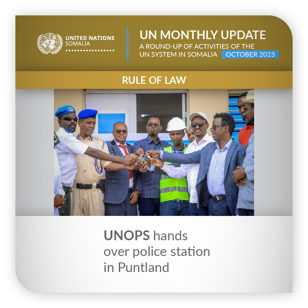 ![]() | Rule of Law | UNOPS hands over police station in Puntland UNOPS helped improve access to justice in Somalia with the handover of the last of 17 newly-constructed police stations and outposts in Abary, Puntland. “This momentous achievement represents a crucial step in extending the reach of formal rule of law institutions, particularly the police, to the communities they serve,” UNOPS said. UNOPS carried out the project through the Joint Police Programme (JPP) – a Somali-led initiative which brings together UNOPS with UNDP, UNPOL and the African Union Transition Mission in Somalia (ATMIS), with the support of the European Union, the United Kingdom and Germany. Launched in 2018, the JPP aims to enhance federal and state-level police forces' effectiveness and accountability, improving security and justice access across Somalia, according to UNOPS. Consolidating contributions from various donors, the JPP works closely with the Ministry of Internal Security to train and equip police, support infrastructure, engage in security sector reform, promote community-oriented policing, and ensure accountable governance. | |